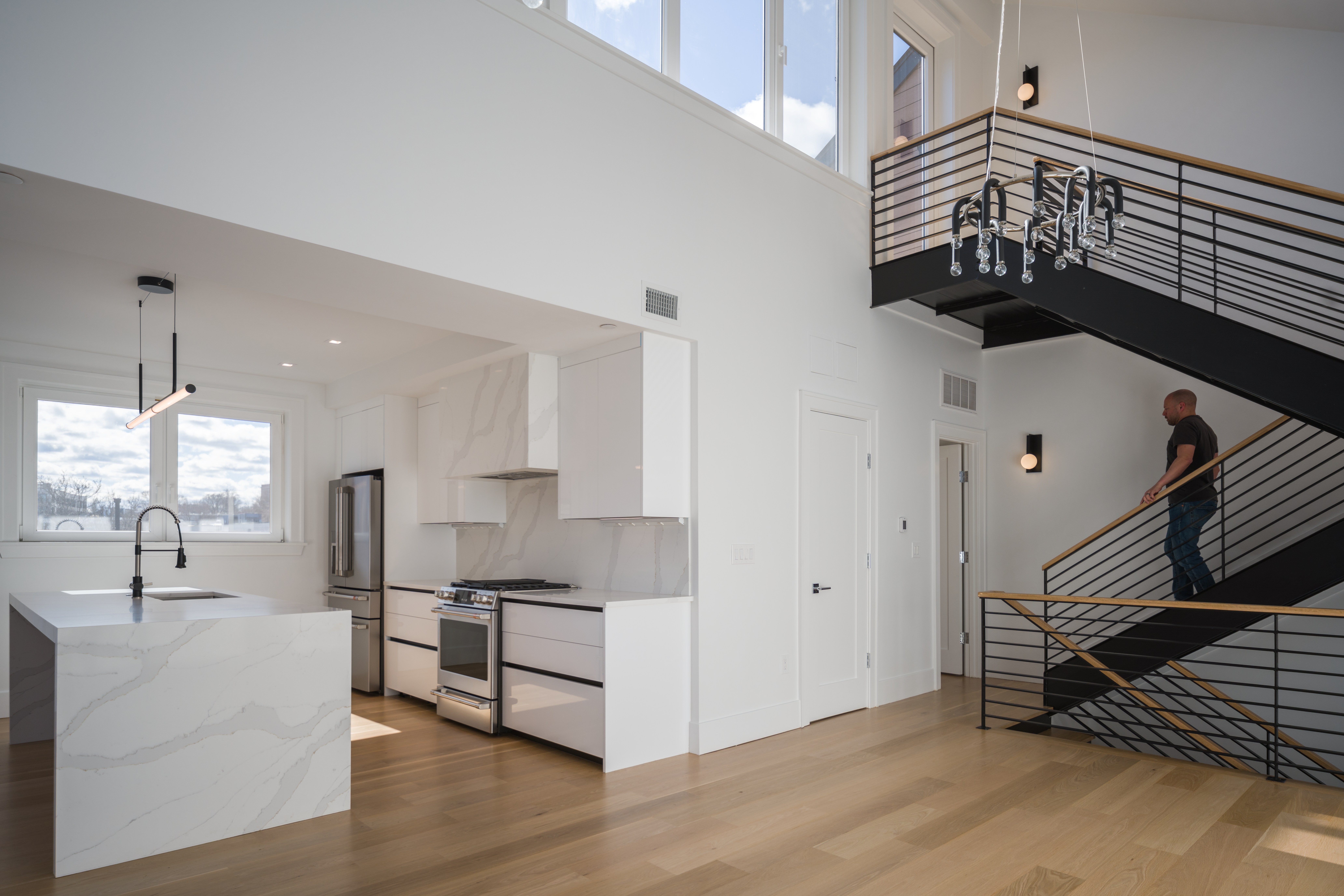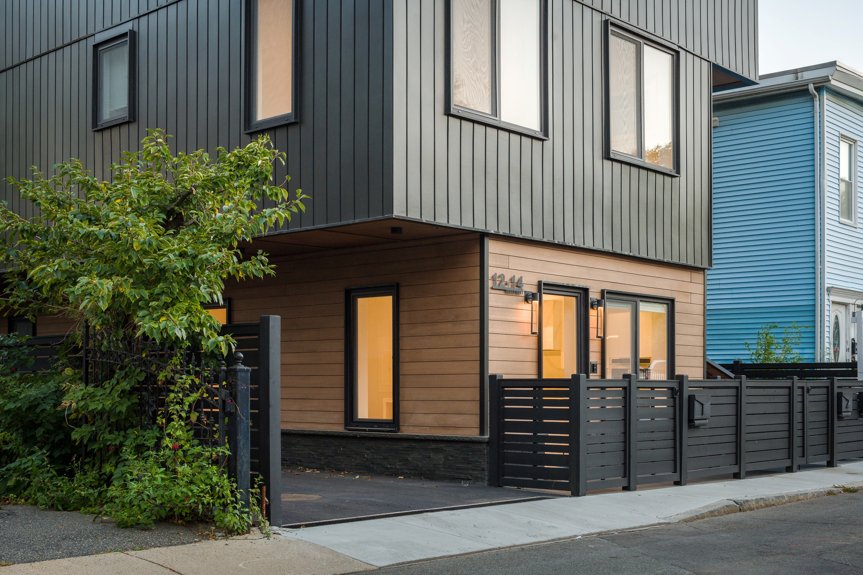 This 3 family condo building in Boston's Dorchester neighborhood is designed to be both be highly efficient, and yet provide uplifting space. The project is shaped by the requirements of the Boston Zoning Code. RODE used these requirements to sculpt the massing of the building. There is a through floor unit at the street level with a garden style patio. The two duplexes have access to private roof decks through a sunlit, double height space. A custom metal stair acts as a sculptural centerpiece to the units. The exterior of the structure is clad in a black siding, with contrasting wood.